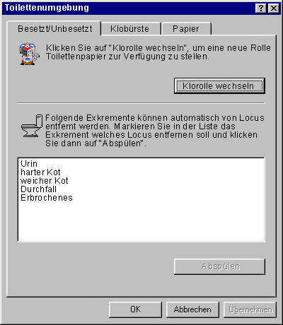 "Ich habe einige Essensreste in die Toilette geschüttet und will sie entsorgen, doch Locus 2000 denkt nicht daran, mir diesen Gefallen zu erweisen. Nach langem Suchen komme ich hinter des Rätsels Lösung: das Herunterspülen von Essensresten wird von Locus 2000 nicht unterstützt...